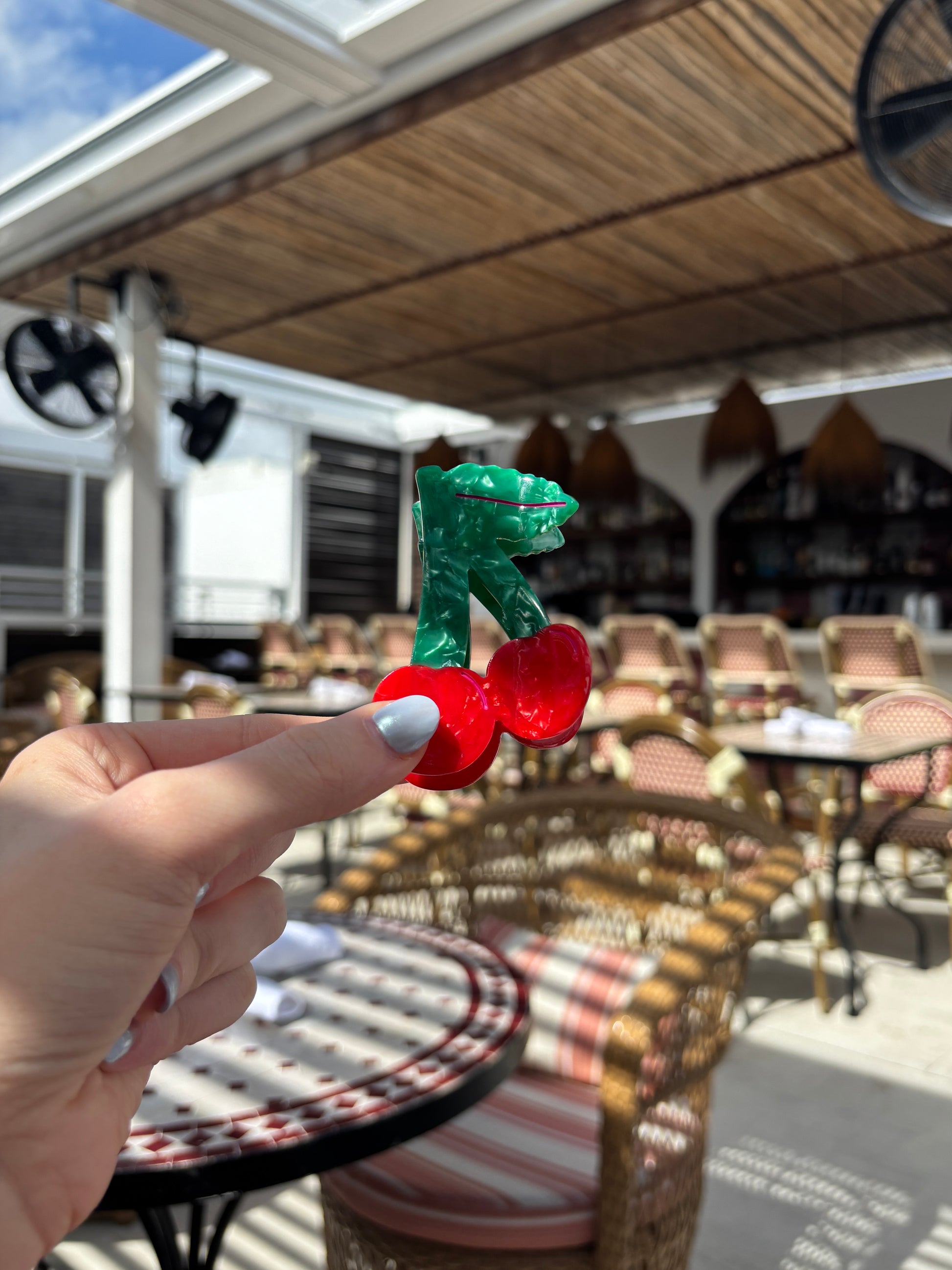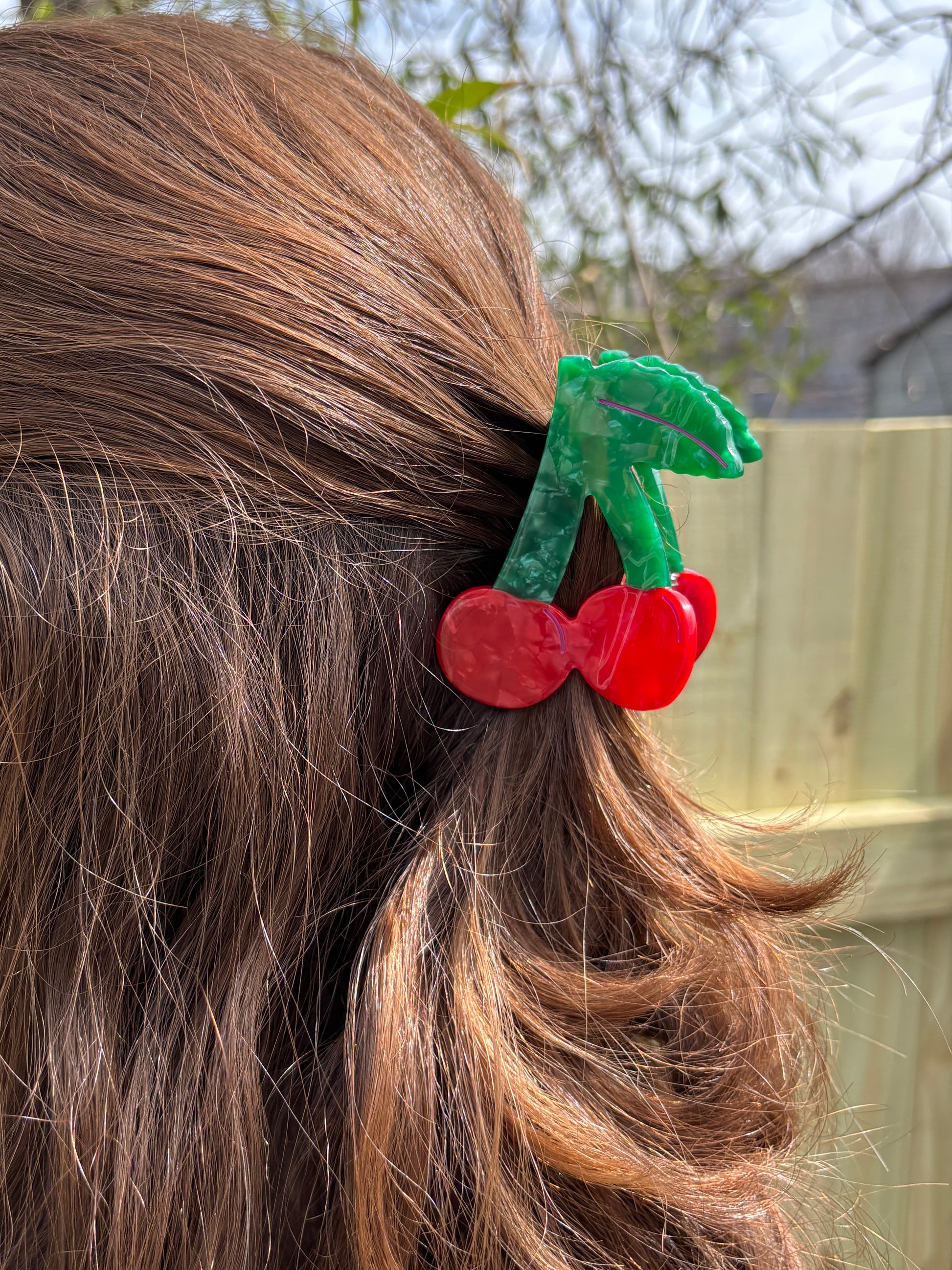 Add a juicy pop of color to your hair with our bold cherry claw clip — the sweetest statement for spring and summer. Made from durable cellulose acetate in glossy red and green, this clip features vibrant cherries with a leafy stem and a swipe of hot pink painted detailing for a playful twist.