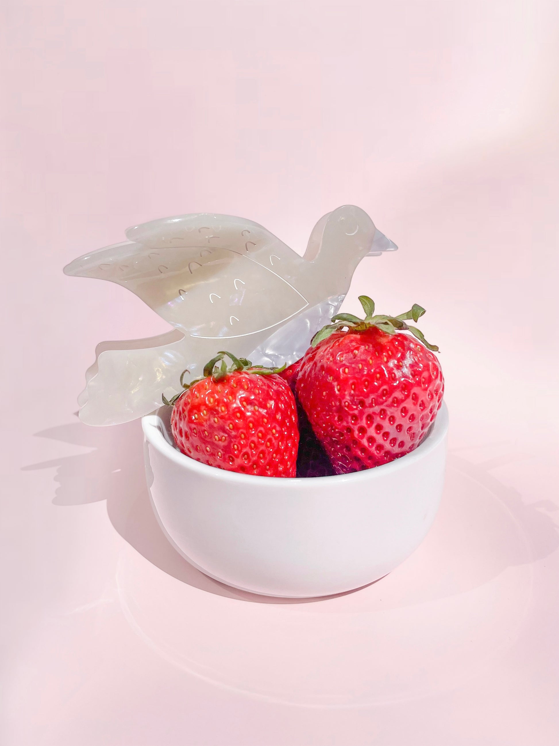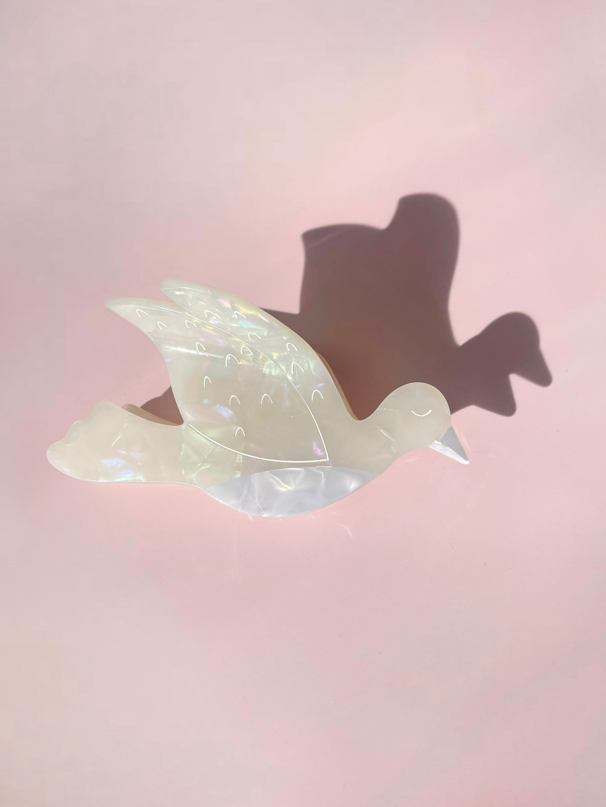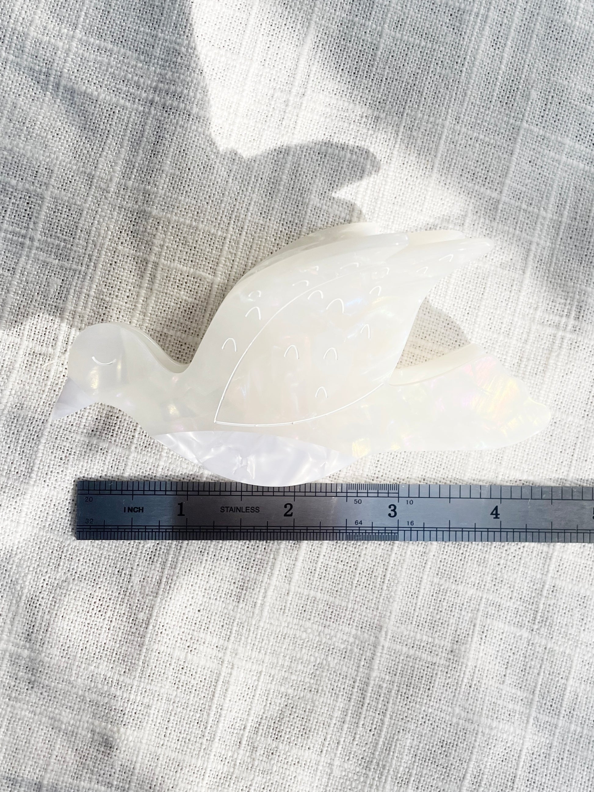 Elegant and serene, the Dove Claw Clip is shaped like a graceful dove, crafted from white and iridescent cellulose acetate with delicate white-painted details. Perfect for creating half-up styles or securing thinner hair in a full updo, this clip is both functional and eye-catching.