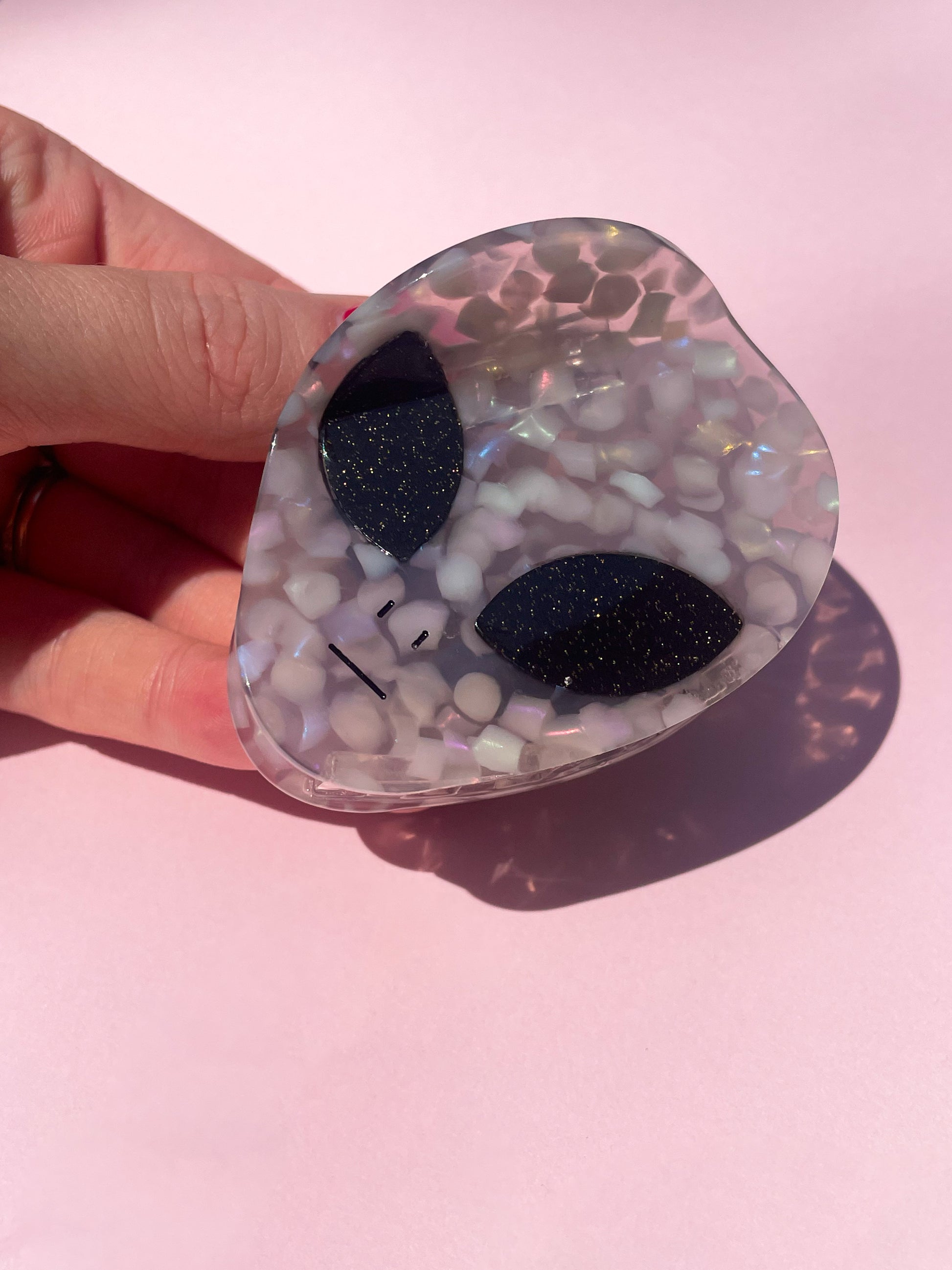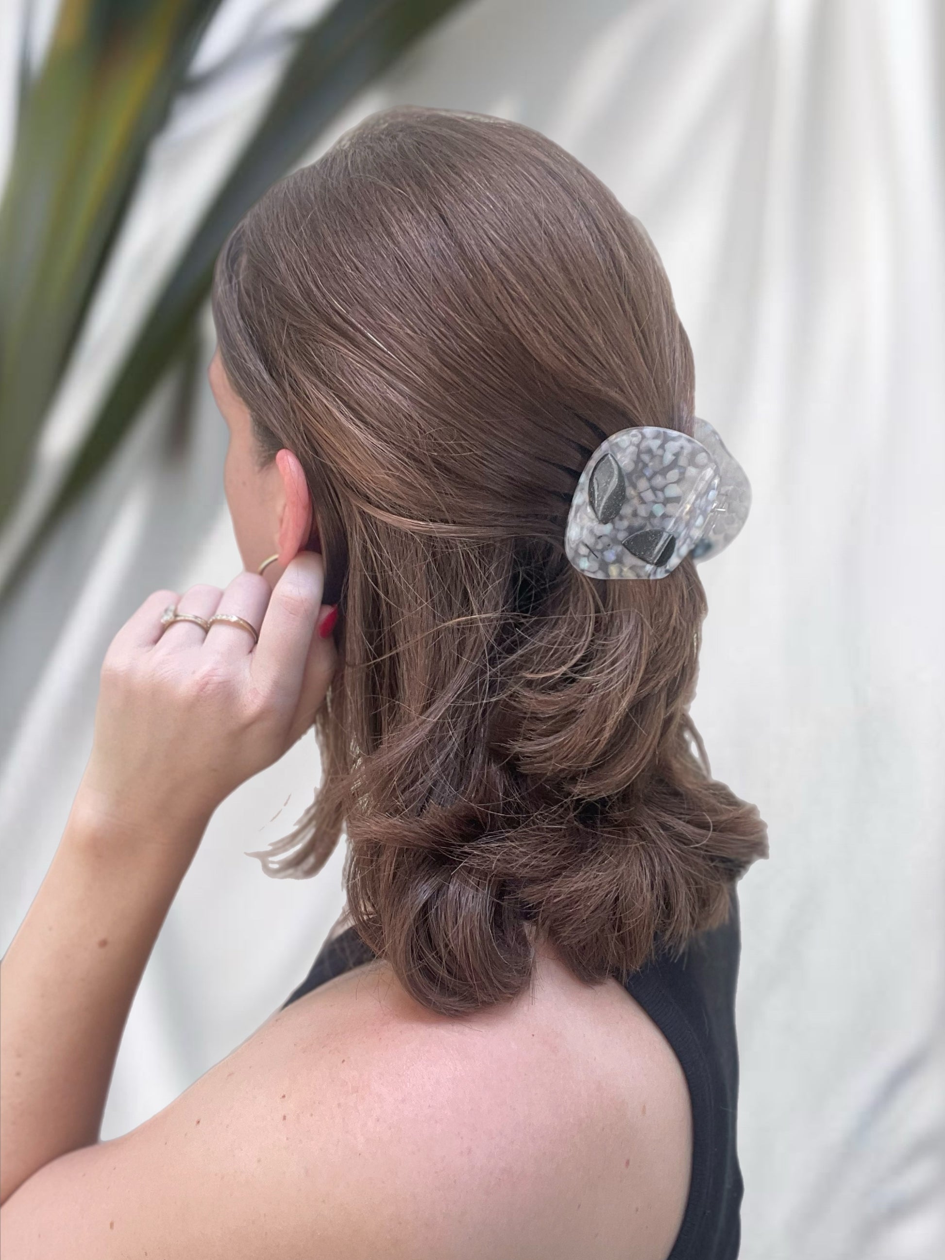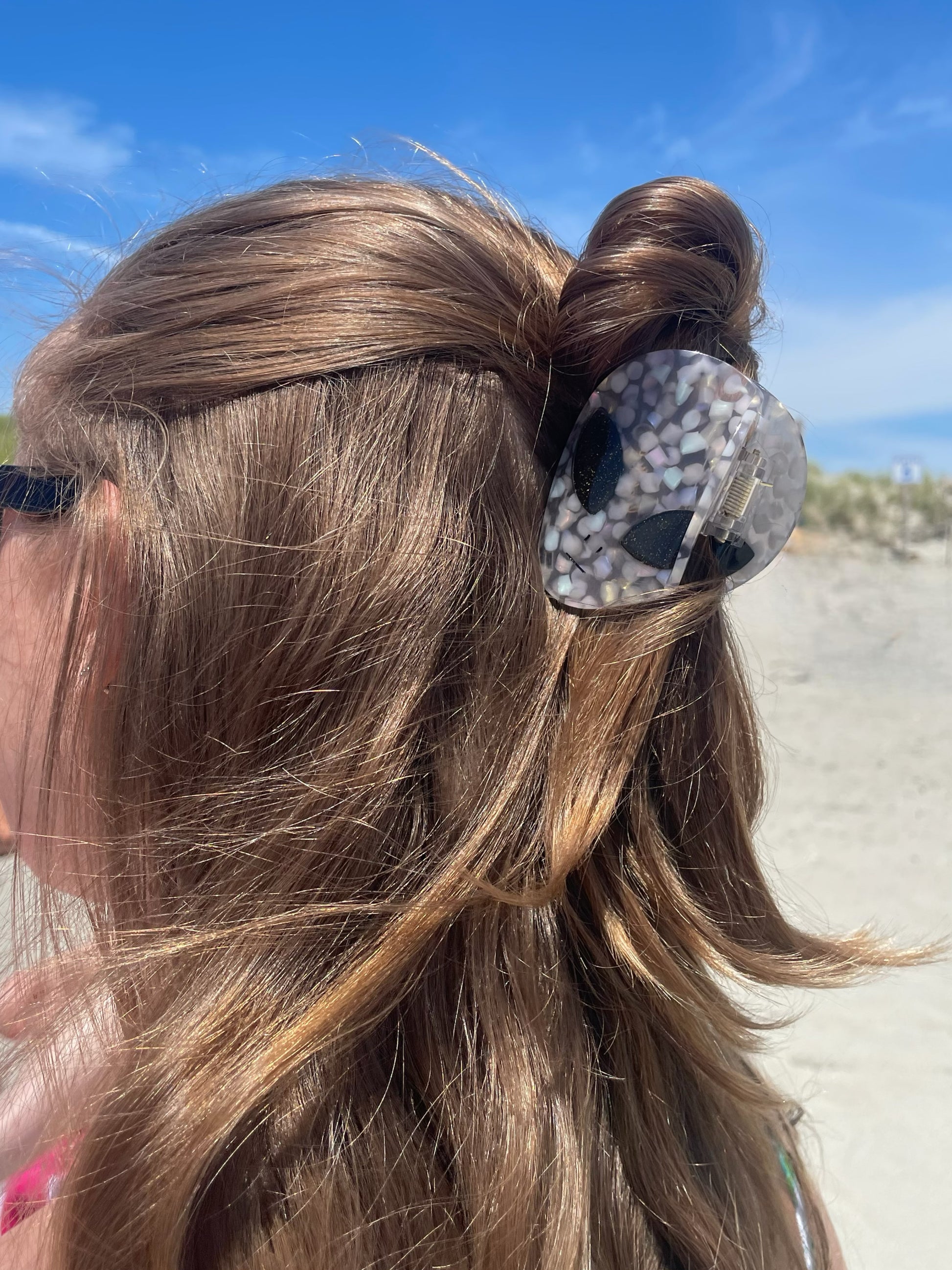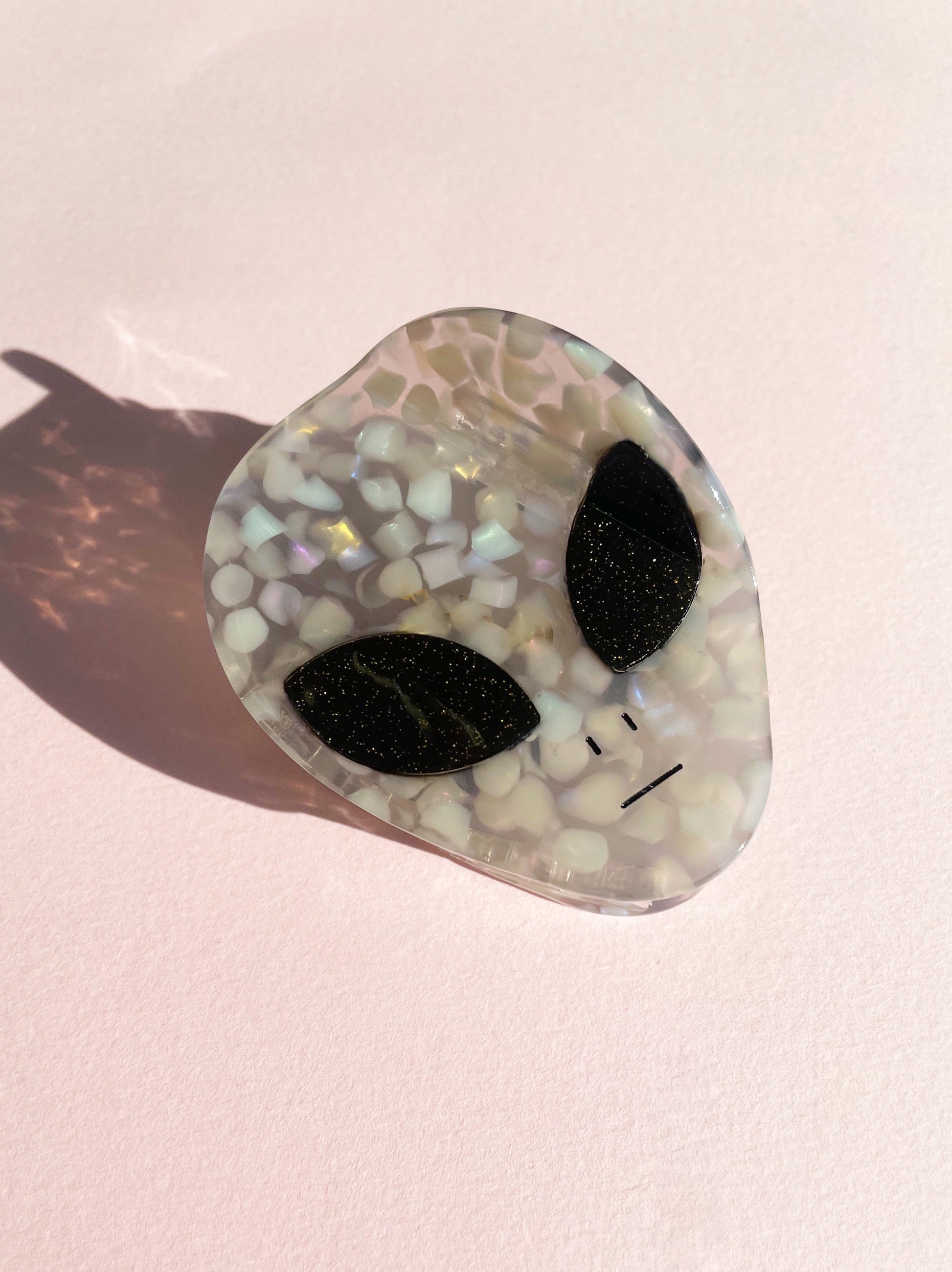 Our gray iridescent alien claw clip, crafted from high-quality cellulose acetate, is a nod to the X-Files enthusiasts and believers of extraterrestrial life. Wear your love for the mysterious and the paranormal with pride.