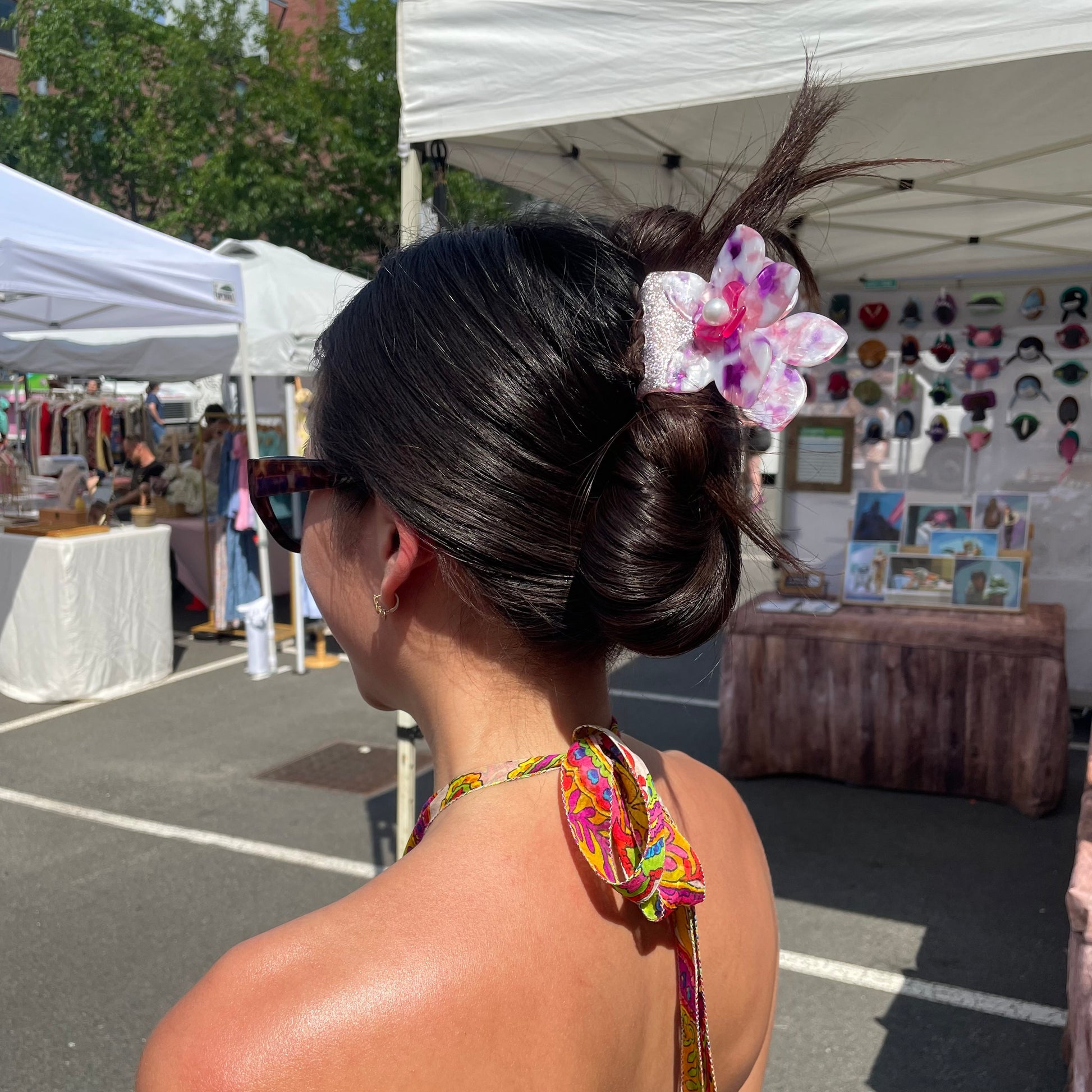 Make your hair the main character with this bold and beautiful orchid claw clip. Featuring soft marbled petals in pink, lilac, and white with a pearl center and glittery pink base. This floral hair accessory is made to stand out — whether you're headed to brunch, a garden party, or just romanticizing your errands.