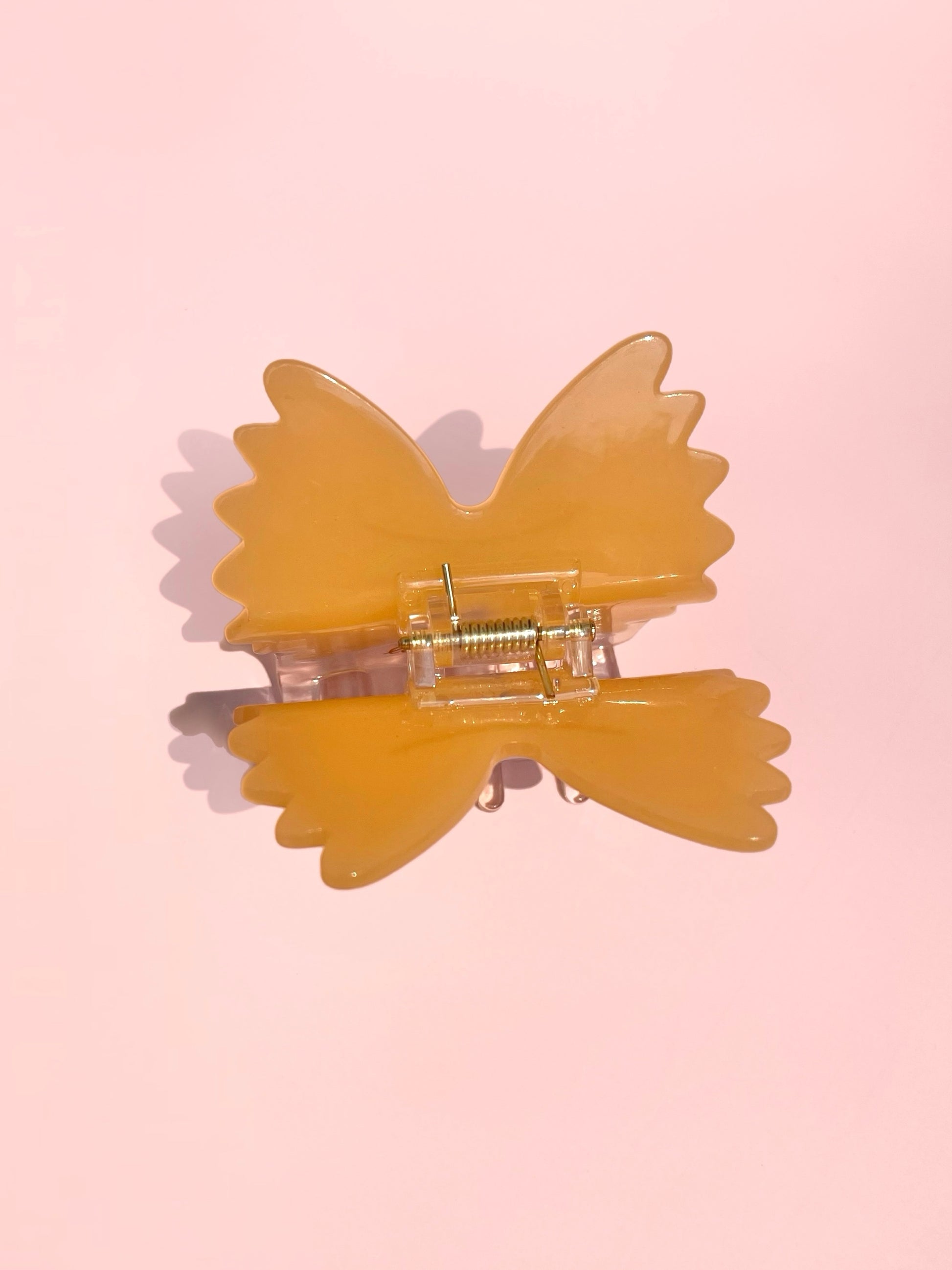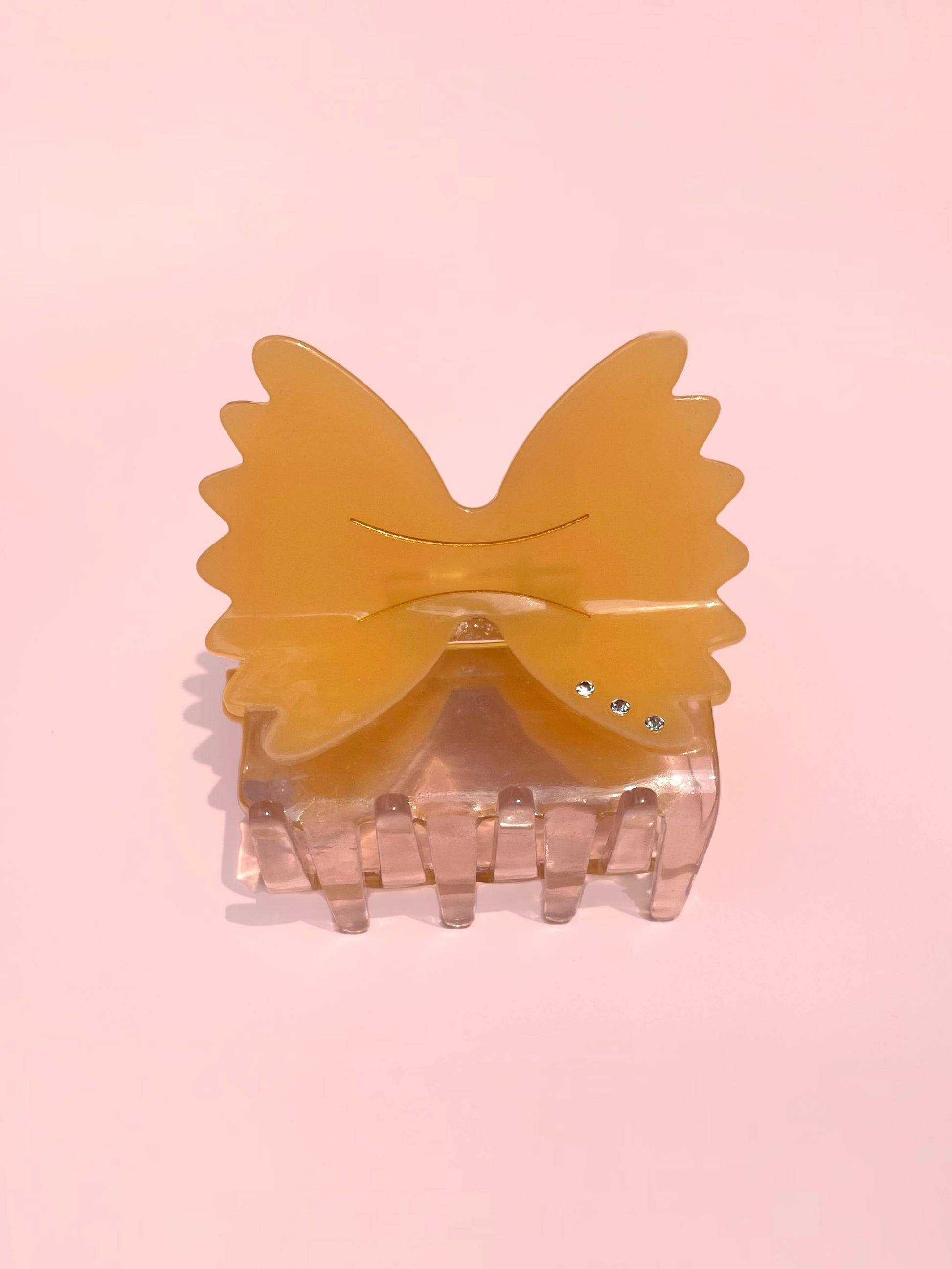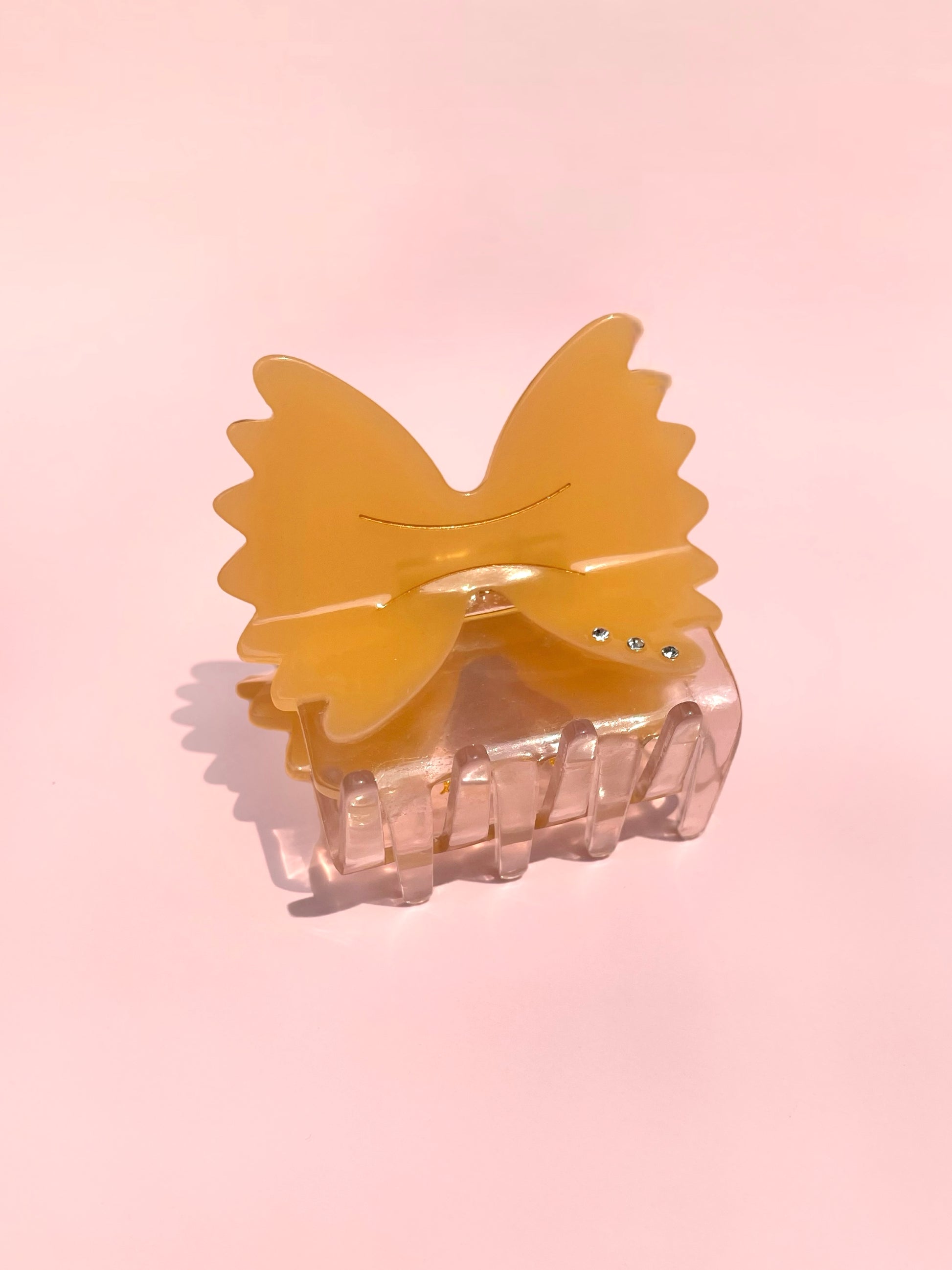 Crafted from sturdy cellulose acetate, this golden-yellow clip is shaped like everyone’s favorite farfalle noodle, complete with hand painted details and a touch of sparkle from tiny rhinestone accents. The clip is 7cm long